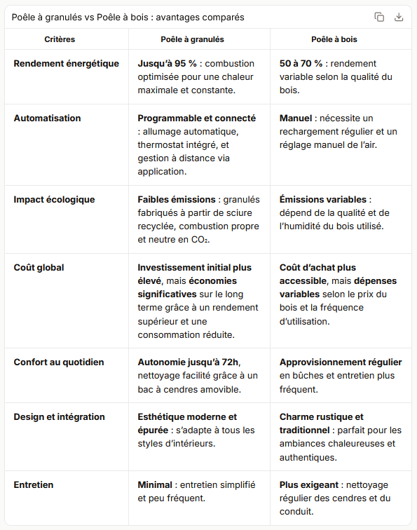 Are you torn between a pellet stove and a wood-burning stove to heat your home? Discover a detailed comparison of the technical, economic, and ecological advantages of these two solutions in the table provided.
